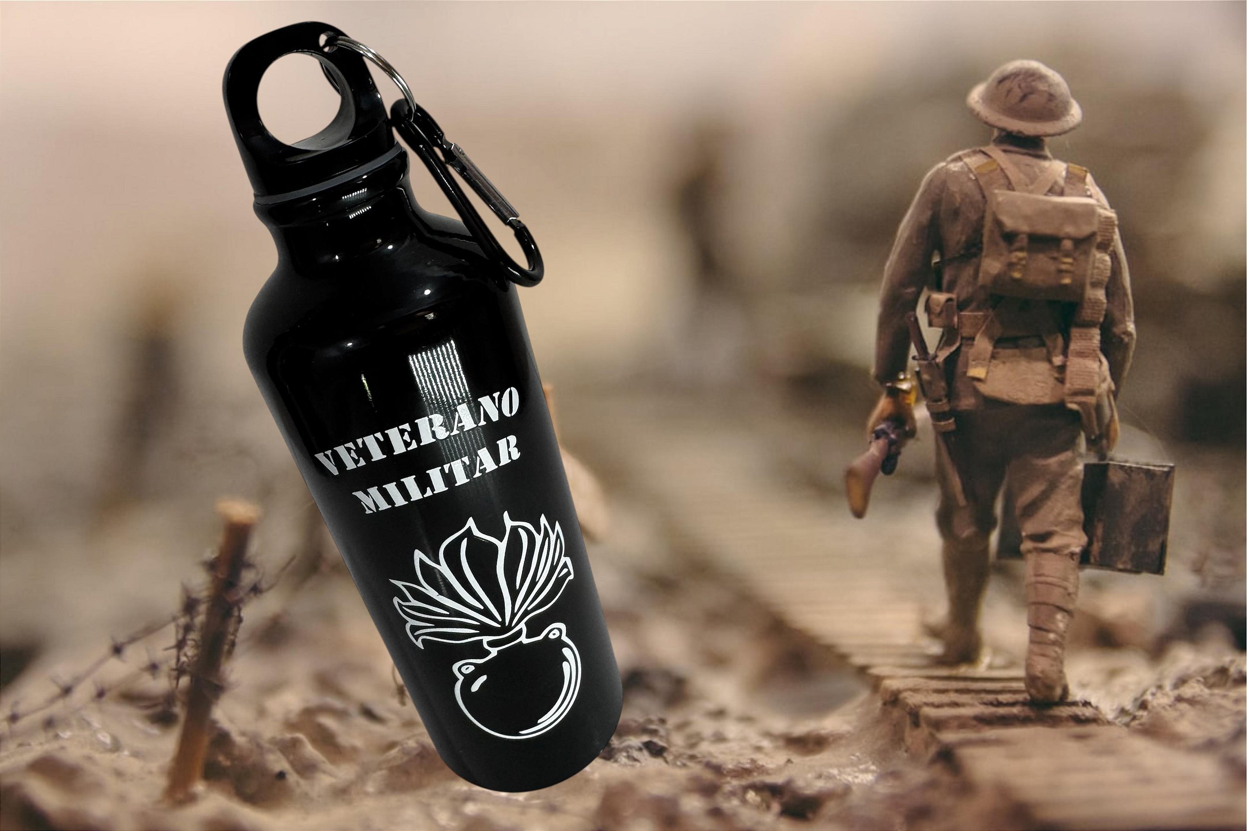 Garrafa em alumínio, modelo granada, com a estampa Veterano Militar Artilharia